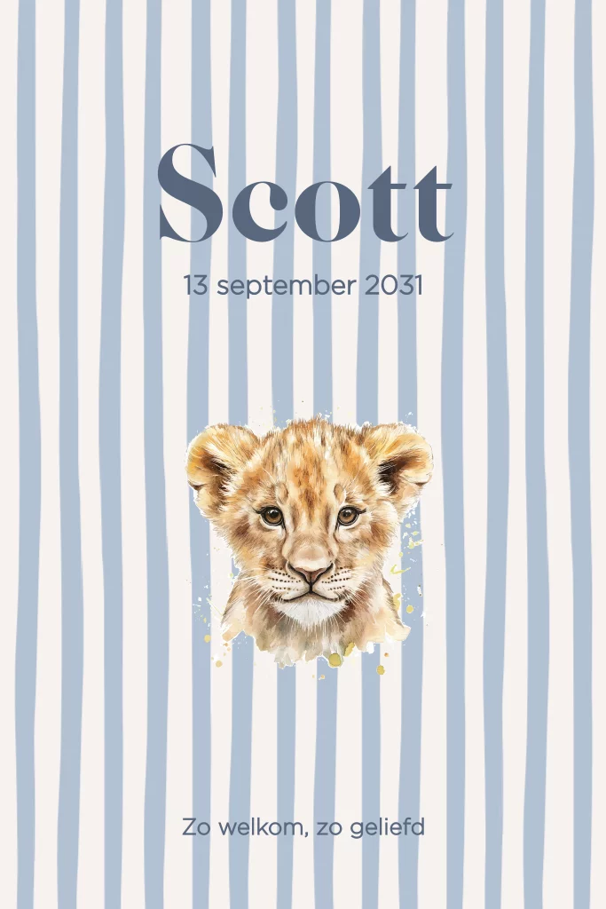 Hou je van uniek en trendy? Kies dan voor dit geboortekaartje waarin een blauwe streep print met een illustratie van een leeuwenkopje met elkaar gecombineerd worden. Het kaartje heeft een stoere uitstraling en is erg leuk voor de geboorte van jullie zoontje.