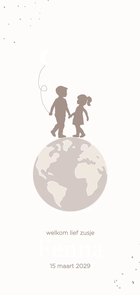 Geboortekaartje broertje en zusje op wereldbol beige en goudfolie