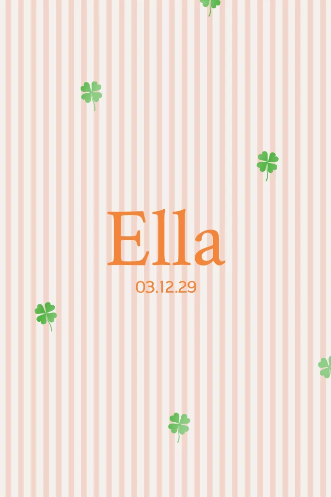Dit unieke geboortekaartje heeft een oranje streepprint met groene klavertjes vier. De klavertjes vier zijn afgewerkt met een hoogglans. Het color blocking effect geeft de kaart een vrolijk en speels karakter.