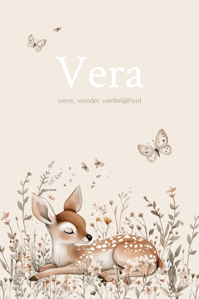 Dit lieve geboortekaartje voor een meisje heeft een aquarel illustratie van een hertje in een bloemenweide. Daaromheen vliegen vlindertjes, wat het kaartje een speelse uitstraling geeft.