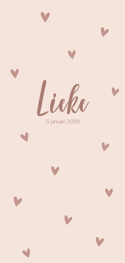 Schattig terracotta-roze geboortekaartje voor een meisje, versierd met liefdevolle hartjes. Door de afgeronde hoeken heeft het geboortekaartje een verfijnde uitstraling. Liever andere kleuren? De kleuren zijn naar wens aan te passen.