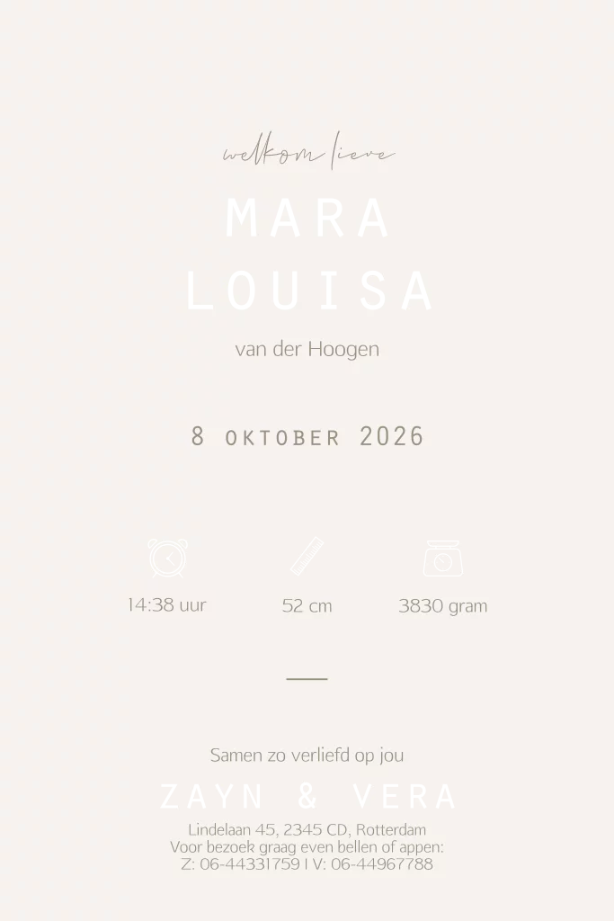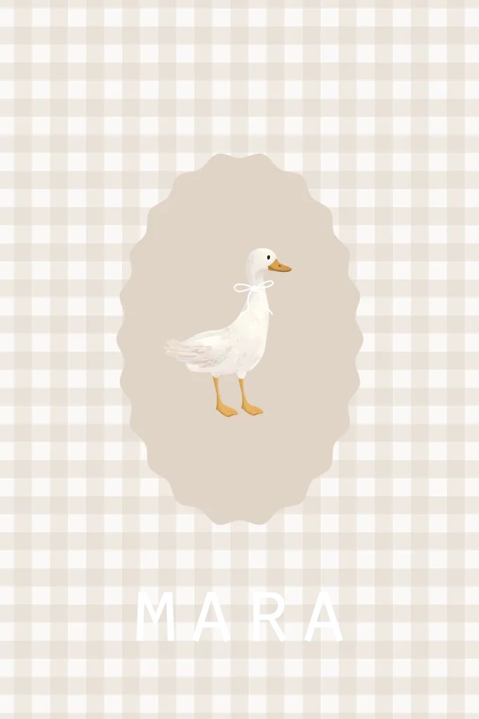 Dit unieke geboortekaartje combineert een klassieke beige ruitprint met een schattig gansje en een sierlijk strikje in goudfolie. De foliedetails geven het kaartje een luxe uitstraling, terwijl het zachte kleurgebruik zorgt voor een warme, lieve sfeer. Een bijzonder ontwerp voor een bijzondere aankondiging.