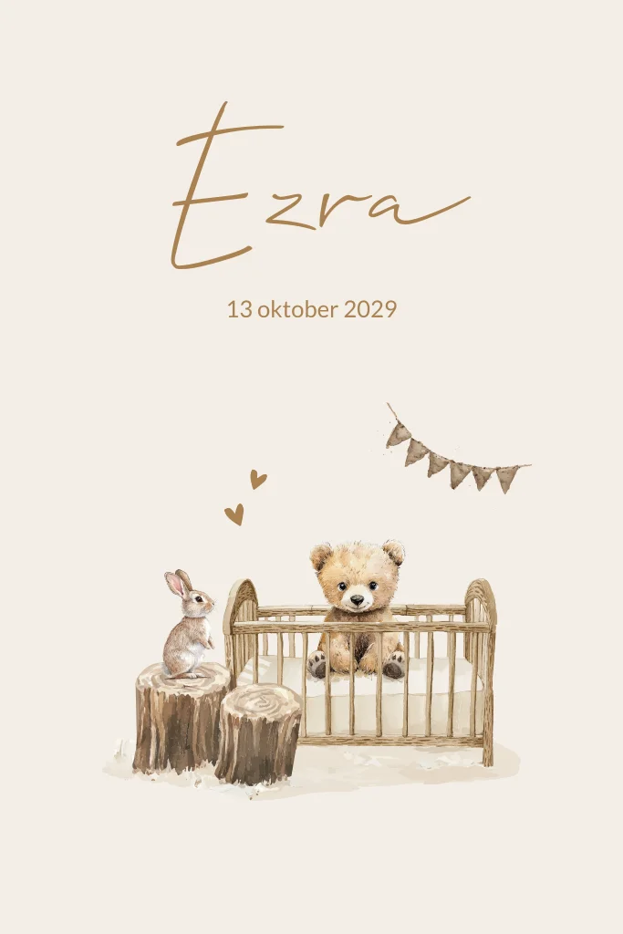 Lief geboortekaartje met een beertje in een knus bedje, vergezeld door een zacht konijntje midden in het bos. De illustratie straalt geborgenheid en rust uit. Ideaal voor een herfst- of winterbaby. Dit kaartje past prachtig bij een natuurlijk en zacht geboortethema. Bestel een proefdruk en bewonder dit kaartje in het echt.