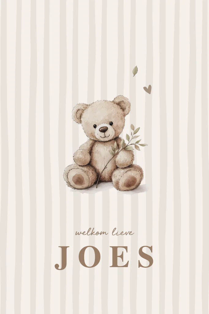 Dit geboortekaartje met beige strepen, een lief beertje en een subtiel takje heeft een moderne, natuurlijke uitstraling. De rustige aardetinten en minimalistische stijl passen prachtig bij een unisex of neutrale babykamer. Het ontwerp combineert eenvoud met warmte, waardoor het kaartje tijdloos en bijzonder blijft. Ideaal voor wie houdt van rust, natuur en zachte details.