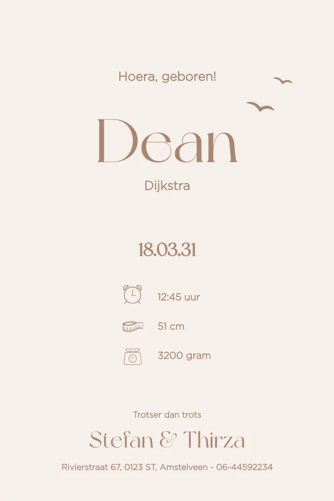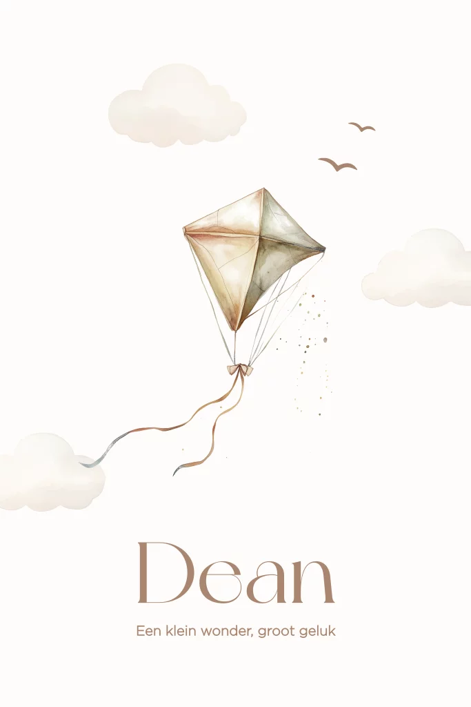 Dit lieve geboortekaartje met een illustratie van een vlieger, een wolkje en kleine vogeltjes straalt zachtheid en vrijheid uit. Dankzij de natuurlijke kleuren en subtiele details past dit kaartje zowel bij een jongen als een meisje. Personaliseer het geboortekaartje eenvoudig en bewonder dit kaartje in het echt met een proefdruk.