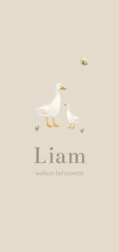 Een zacht geboortekaartje in zandkleur met twee schattige gansjes – perfect om de komst van een broertje of zusje aan te kondigen. Het ontwerp straalt rust en eenvoud uit. Maak het geboortekaartje compleet met een bijpassende sluitsticker.