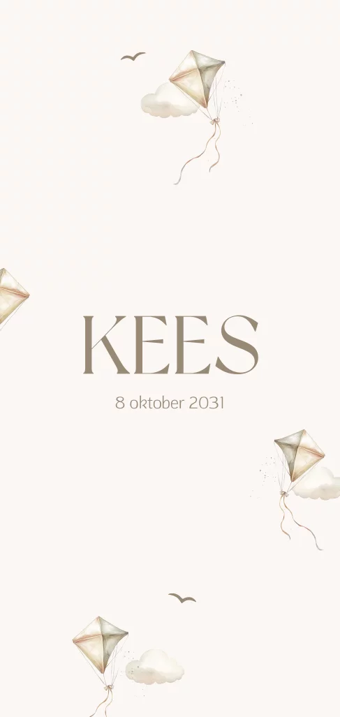 Een geboortekaartje met een schattige vlieger print en zachte wolkjes voor een dromerige look. Dit unieke ontwerp straalt rust en lichtheid uit en is perfect voor een stijlvol en modern geboortekaartje. De speelse details maken het kaartje extra bijzonder voor de aankondiging van jullie kleintje. Pas het eenvoudig aan naar wens. Liever een ander formaat? Stuur ons een berichtje. Wij helpen je graag.