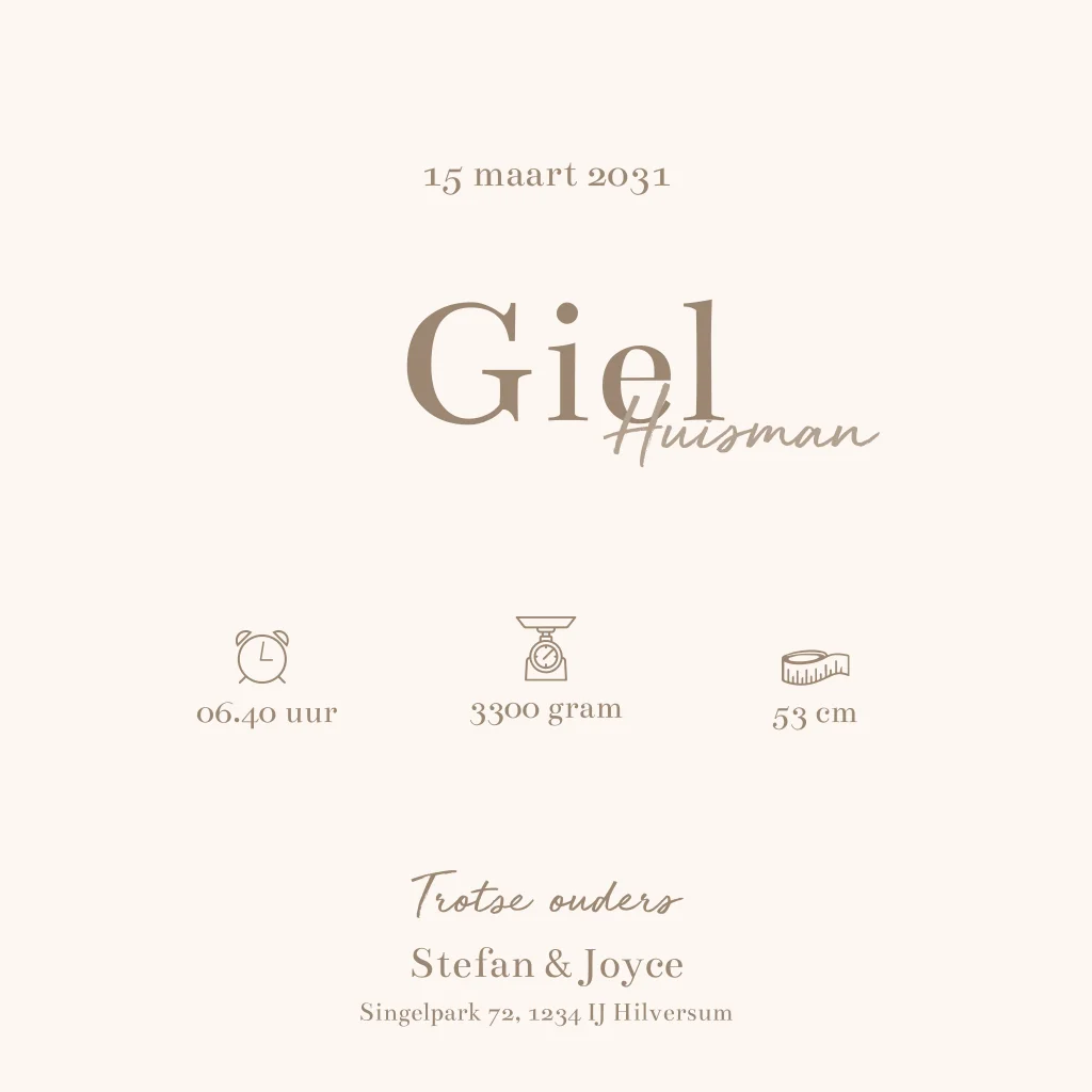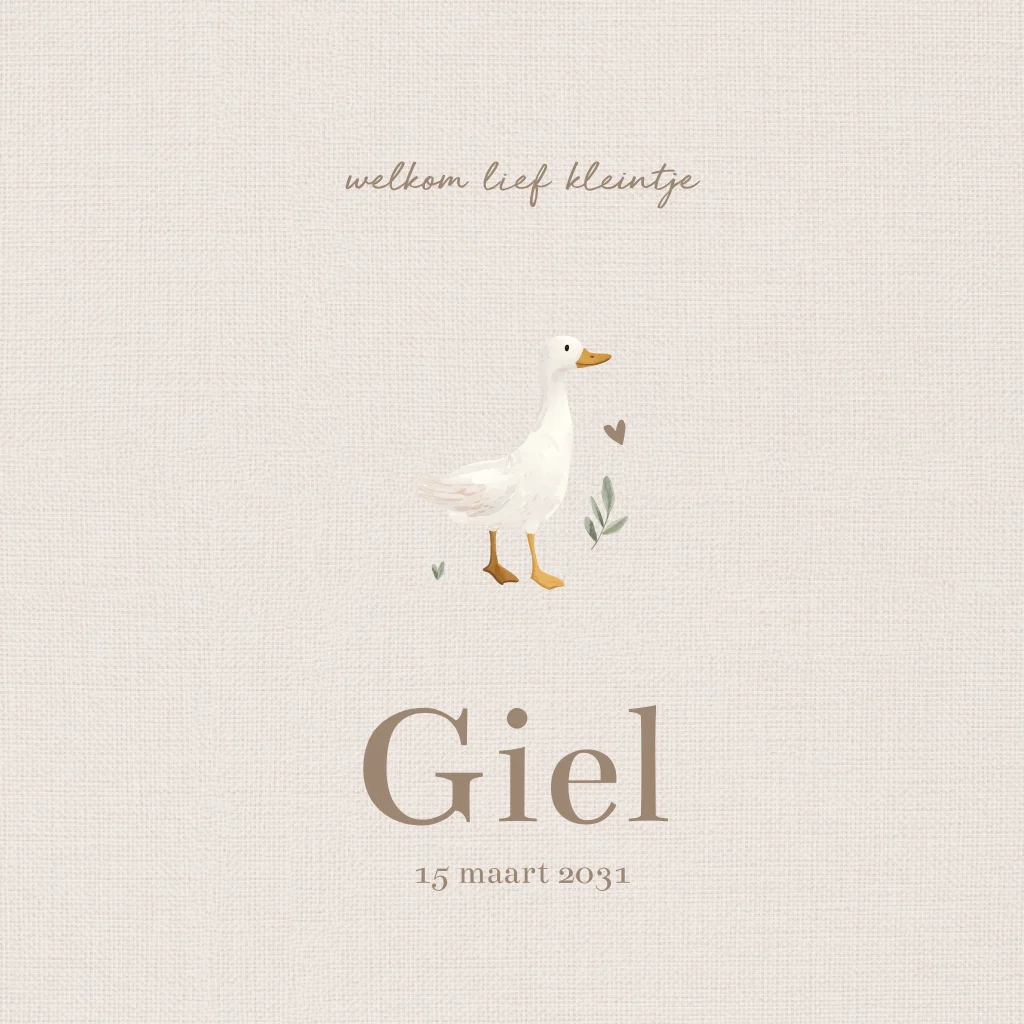 Een zacht en tijdloos geboortekaartje met linnenlook achtergrond, een lief gansje en een subtiele blaadje. Dit ontwerp straalt rust en eenvoud uit en past perfect bij een natuurlijke stijl. Kies je eigen tekst en maak het kaartje helemaal persoonlijk.
