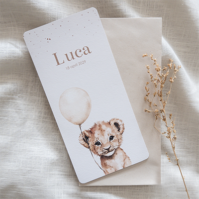 Dit geboortekaartje heeft een aquarel illustratie van een leeuwtje met een beige ballon. Door de neutrale kleuren is dit geboortekaartje geschikt voor zowel jongens als meisjes.