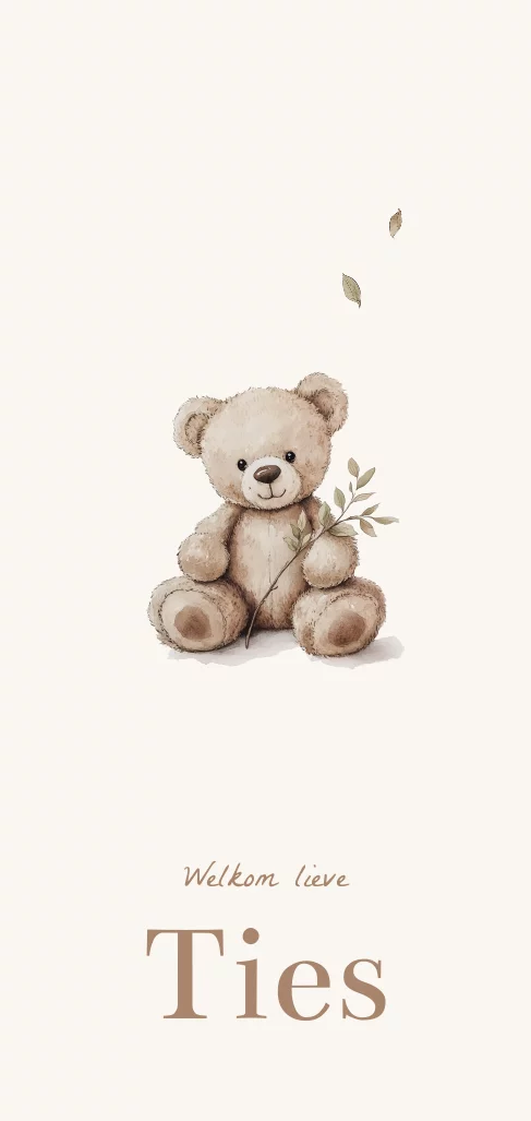 Een zacht en tijdloos geboortekaartje met een lieve illustratie van een beertje, omringd door subtiele blaadjes. De neutrale kleuren maken dit kaartje perfect voor zowel een jongen als een meisje. Een warme en stijlvolle manier om jullie kleintje te verwelkomen. Verzend het kaartje met een bijpassende envelop en sluitsticker met beertje.