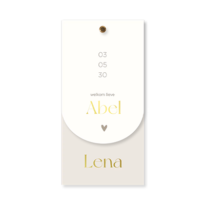 Maak het geboortekaartje voor jullie tweeling extra speciaal door de verschillende labels met goudfolie. De beige kaart is 10x20 cm en het boogvormige label is 10x15 cm. De kaartjes bevestig je eenvoudig aan elkaar met een splitpen Deze mag je er los bij bestellen.