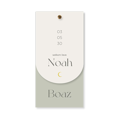 Dit geboortekaartje voor een tweeling bestaat uit natuurlijke kleuren en heeft een klein detail van een gouden maantje. De groene kaart is 10x20 cm en het offwhite label is 10x15 cm. De kaartjes bevestig je eenvoudig aan elkaar met een splitpen Deze mag je er zelf bij bestellen.