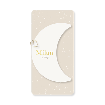 Een subtiel en stijlvol geboortekaartje in neutraal beige, perfect voor zowel jongens als meisjes. Het maanvormige label met goudfolie geeft een vleugje luxe en een dromerige uitstraling. Dankzij de zachte tinten past dit ontwerp bij elke stijl en elk seizoen. Maak het kaartje persoonlijk door de tekst en details naar wens aan te passen! Bevestig het maanlabel van 9x14 cm aan het geboortekaartje van 10x20 cm met een paperclip naar keuze.