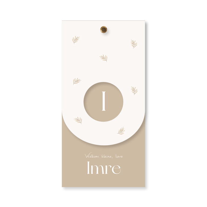 Dit neutrale geboortekaartje heeft een label met doorkijkje naar de voorletter van jullie kindje. De illustraties van de blaadjes maken dit kaartje helemaal af. Het geboortekaartje is 10x20 cm en het label is 10x15 cm. Het label bevestig je eenvoudig met een splitpen. Deze zijn los erbij te bestellen. De hulplijnen in het ontwerp worden niet mee gedrukt. Deze zijn er om jou te helpen met het uitlijnen in de editor.