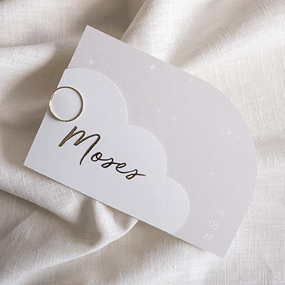 Dit beige geboortekaartje is lief en uniek tegelijk. De afgeronde hoofdkaart is 16x11 cm en het wolkjes label met goudfolie is 12x8 cm. Bevestig het wolkjes label met een paperclip aan de hoofdkaart. De paperclips kun je zelf erbij bestellen.