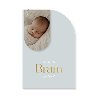 Maak het geboortekaartje voor jullie kleintje extra persoonlijk met een foto op het label. Het grijsblauwe geboortekaartje met goudfolie is 11,5x17 cm en het fotolabel is 5,5x8,5 cm. Bevestig het fotolabel met een paperclip aan het geboortekaartje. Deze kun je erbij bestellen.