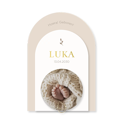 Dit luxe geboortekaartje bestaat uit 3 losse labels. Bevestig de labels aan elkaar met een paperclip naar keuze aan het geboortekaartje. Deze mag je er los bij bestellen. Het beige geboortekaartje is 11x16 cm, het offwhite label is 8,5 x 13 cm en het ronde fotolabel heeft een doorsnede van 7 cm.
