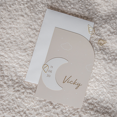 Ben je ook helemaal in de wolken van dit beige geboortekaartje met sterretjes? Het geboortekaartje is ook nog eens luxe afgewerkt met een label in de vorm van een maan en goudfolie. Het label bevestig je eenvoudig met een paperclip aan het geboortekaartje. De paperclip mag je zelf los erbij bestellen. Het geboortekaartje is 11,5x17 cm en het label is 6x8 cm. Het lijntje in het ontwerp is om aan te geven tot waar je de naam kunt laten lopen. Anders verdwijnt deze achter het maan label. Het lijntje wordt niet gedrukt.