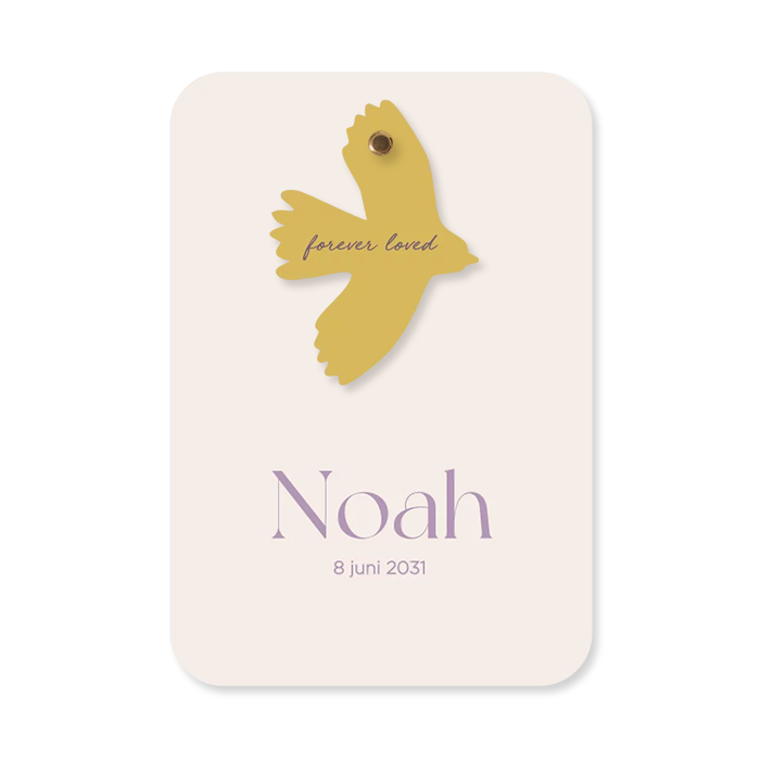 Dit bohemian geboortekaartje heeft een stijlvolle offwhite basis met een speels okergeel label van een lief vogeltje. De natuurlijke kleuren en het subtiele design geven het kaartje een dromerige en trendy uitstraling. Het geboortekaartje is 11x16 cm en het vogeltjes label is 5,5x7,5 cm. Bevestig het label met een splitpen aan het geboortekaartje.