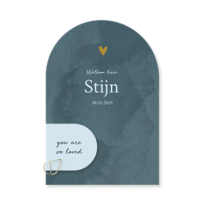 Dit geboortekaartje is stoer en trendy tegelijk. De boogvormige hoofdkaart heeft een aquarel achtergrond en is 11x16 cm. Het boogvormige, lichtblauwe label is 5x4,5 cm. Je kunt het label met een paperclip aan de hoofdkaart bevestigen. De paperclips kun je los bijbestellen.