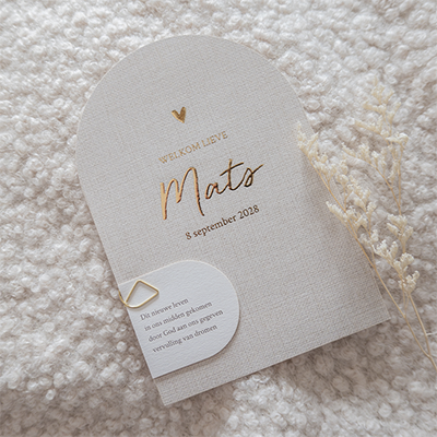 De boogvorm en de goudfolie geven dit geboortekaartje een originele en stijlvolle uitstraling. De linnenlook hoofdkaart is 11x16 cm en het label 5x4,5 cm. Je kunt het label met een paperclip aan de hoofdkaart bevestigen. De paperclips kun je los bijbestellen.