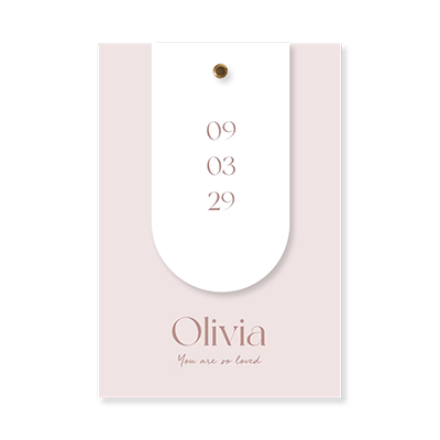 Dit geboortekaartje voor meisjes is uniek door het witte booglabel. De hoofdkaart is 11x16 cm en het booglabel is 6x11 cm. Bevestig het booglabel met een splitpen of oud roze fluwelen lint aan het geboortekaartje. Deze kun je er zelf bij bestellen.