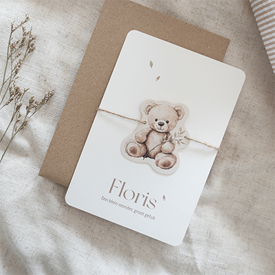 Dit schattige geboortekaartje met label is perfect voor een zachte en warme aankondiging van jullie kindje. De lieve illustratie van het beertje en het subtiele takje geven het kaartje een natuurlijke uitstraling. Knoop het beertjes label met een touwtje aan het geboortekaartje. Je kunt zelf een touwtje naar keuze bij de kaart bestellen.