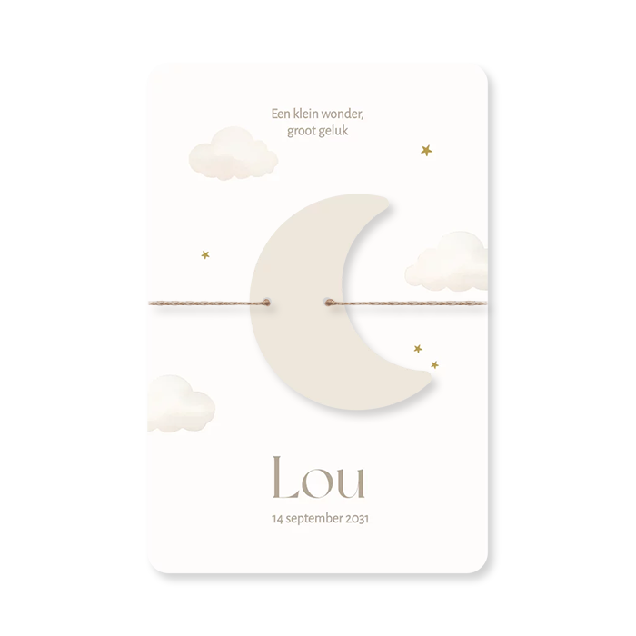 Hoe mooi is dit neutrale geboortekaartje met illustraties van wolkjes en sterretjes. Het label in de vorm van een maan maakt dit kaartje helemaal af. Het geboortekaartje is 11,5x17 cm en het label is 6x7 cm. Je kunt het label met een touwtje aan het geboortekaartje bevestigen. Bestel zelf een touwtje naar keuze bij het geboortekaartje.