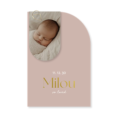 Met dit oudroze geboortekaartje kun je aan iedereen laten zien hoe knap jullie kleine meisje is. Het geboortekaartje heeft een luxe uitstraling van de goudfolie en een organische vorm. Het formaat van het geboortekaartje is 11,5x17 cm en van het fotolabel 5,5x8,5 cm. Bevestig het fotolabel met een paperclip naar keuze aan het geboortekaartje. Deze mag je er los bij bestellen.