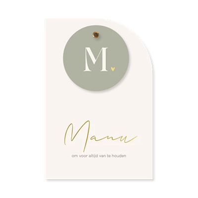 Dit uni geboortekaartje is een prachtige combinatie van eenvoud en luxe. De rustige basis wordt stijlvol aangevuld met een rond label in zachtgroen en elegante accenten in goudfolie. Perfect voor ouders die houden van een strak design met een subtiele, chique touch. Het kaartje is 11,5 x 17 cm en het ronde label heeft een doorsnede van 7 cm. Bevestig het label eenvoudig met een splitpen of lint naar keuze en maak het geboortekaartje helemaal af.