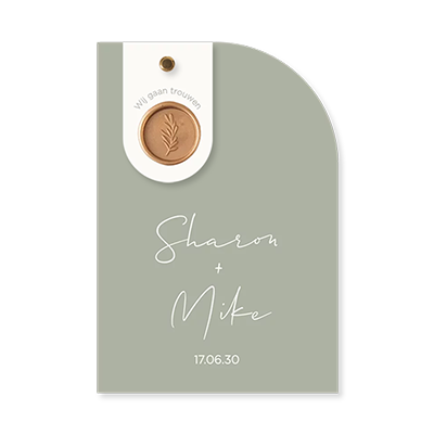 Deze afgeronde trouwkaart van 11x16 cm heeft een stijlvol offwhite label van 4x6,5 cm. Je kunt het offwhite label met een splitpen of zijden lint bevestigen aan de hoofdkaart. Plak een lakzegel met blaadje op het offwhite label en jullie kaart is helemaal klaar! De extra artikelen kun je zelf los bij bestellen.