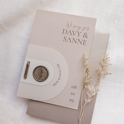 Op zoek. naar een exclusieve trouwkaart die past bij jullie bohemian bruiloft? Deze trouwkaart is daar door de bruintinten en lakzegel met blaadje erg geschikt voor. De hoofdkaart is 11,5x17 cm, het beige label is 8,5x10 cm en het offwhite label is 9x4,5cm. Plak een lakzegel met blaadje op het offwhite label en de kaart heeft gelijk een bohemian uitstraling. De labels kun je aan elkaar bevestigen met een paperclip. Deze extra producten mag je zelf los erbij bestellen.