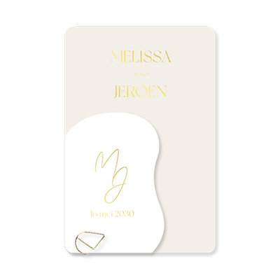 Een chique beige trouwkaart met wit organisch label en subtiele details in goudfolie. Het design uit de Modern Luxury trouwhuisstijl is perfect voor een chique en tijdloze bruiloft. De kaart is 11,4x17,1 cm en het label is 7,5x10,5 cm. Bevestig het label eenvoudig aan de kaart met een gouden paperclip naar keuze.