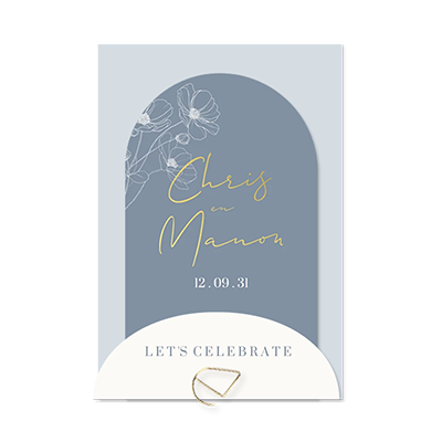 Een luxe trouwkaart met blauwe tinten en een gedetailleerde bloemenillustratie voor een moderne, romantische look. De kaart van 11×16 cm wordt geleverd met een staand booglabel van 8,5×14,5 cm en een liggend booglabel van 11×4 cm. Combineer de labels met een paperclip naar keuze voor een stijlvolle afwerking. De trouwkaart sluit mooi aan bij de trouwhuisstijl Botanical Blue.