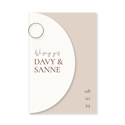 Deze trouwkaart krijgt een bohemian sfeertje door de bruintinten en organische vormen. De hoofdkaart is 11,5x17 cm en het half ronde label is 7,5x17 cm. Bevestig de kaarten aan elkaar met een paperclip. Deze kun je zelf erbij bestellen.