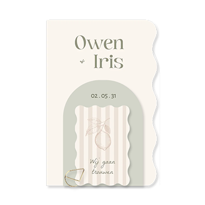 Deze hippe trouwkaart met golfranden combineert beige en groene tinten met een hippe, gestreepte print. Het ontwerp past binnen de Sage & Sand trouwhuisstijl en heeft een uniek karakter. De trouwkaart is 11,4x17,1 cm, de groene kaart 8x11 cm en het streeplabel 5,5x8 cm. Bevestig de labels met een paperclip naar keuze voor een strakke afwerking.