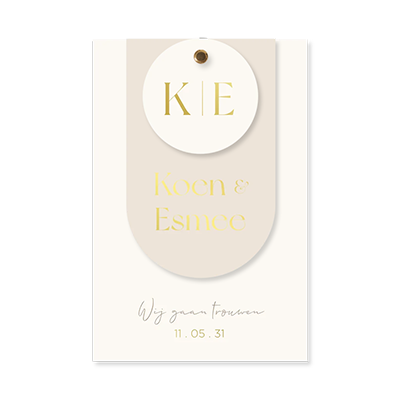 Deze klassieke trouwkaart heeft een basis van 11,4 x 17,1 cm en wordt geleverd met een booglabel van 8 x 12,5 cm en een rond label van 6 cm doorsnee. De monogram in goudfolie en de zachte beige tinten sluiten perfect aan bij de Purely Beige trouwhuisstijl. Bevestig de labels eenvoudig met een splitpen of lint naar keuze voor een speelse laagjeslook. Een prachtige kaart die klasse en persoonlijkheid uitstraalt.