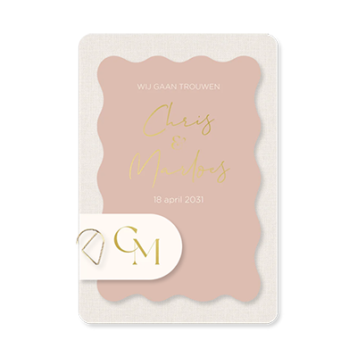 Kies voor een unieke trouwkaart in de stijl van Pure Linen. De roze golfkaart en subtiele goudfolie accenten maken dit ontwerp warm, chic en bijzonder. De linnen kaart is 11x16 cm, de roze golfkaart is 9x13,5 cm en het booglabel met gouden monogram is 5,5x3,5 cm. Bevestig de labels met een paperclip naar keuze.