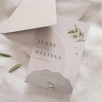 Uniek en stijlvol: deze minimalistische trouwkaart met labels in bijzondere vorm past prachtig binnen de Olive Garden trouwhuisstijl. De natuurlijke details geven een moderne, maar warme uitstraling. De kaart met labels worden bij elkaar gedrukt op een vel van 21x21 cm. De offwhite kaart is 11x16 cm, de beige kaart is 7,5x13,5 cm en het olijfgroene label is 11x4 cm. Zo heb je een mooie mix van verschillende formaten en kleuren.