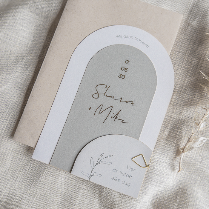 Verras jullie gasten met deze exclusieve trouwkaart met labels en goudfolie. De hoofdkaart is 11x16 cm, de langwerpige kaart is 8x14 cm en de liggende kaart is 7x5 cm. Voeg de labels samen met een paperclip. Deze kun je zelf erbij bestellen en vind je bij de Extra producten.