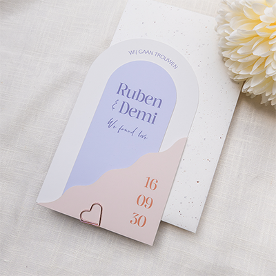 Kan je niet kiezen uit de mooie perzikkleur of lila? Combineer deze kleuren in deze boogvormige trouwkaart met labels. De witte hoofdkaart is 10x16,5 cm, de lila kaart is 6x15 cm en het perzikkleurige label is 9x10 cm. De kaarten kun je met een paperclip aan elkaar bevestigen. Deze vind je bij de Extra producten.