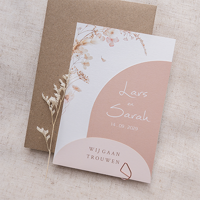 Deze trouwkaart met droogbloemen en roze labels heeft een romantische en hippe uitstraling. De zachte tinten en bloemendetails sluiten perfect aan bij de trouwhuisstijl Wild Flowers. Dankzij de labels kun je op een geordende manier veel informatie op deze kaart kwijt. De trouwkaart is 11x16 cm, het donkerroze booglabel is 8x13,5 cm en het lichtroze label is 11x4,5 cm. Bevestig de labels aan elkaar met een paperclip. Deze mag je zelf erbij bestellen.