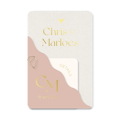 Deze romantische trouwkaart combineert een zachte linnenlook met 2 extra labels. Dit geeft de kaart een luxe uitstraling. De trouwkaart is 11x16,5 cm, de kaart met details is 8,5x8,5 cm en het roze golflabel is 11x12 cm. Let op: het roze golflabel staat geroteerd, zodat de labels allemaal op 1 drukvel van 21x21 cm passen. Plaats je artwork hierop dus op zijn kop. De trouwkaart sluit aan bij de Pure Linen trouwhuisstijl en geeft jullie bruiloft een warme, stijlvolle uitstraling. De golvende vorm voegt een speels detail toe aan het tijdloze design. Laat jullie liefde stralen met deze unieke kaart.