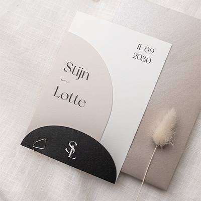 Labelkaarten zijn de trend van het moment. Het geeft de trouwkaart een unieke uitstraling en je kunt er veel informatie op kwijt. Deze minimalistische trouwkaart is 11x16 cm, het halve booglabel is 8x13,5 cm en het half ronde label is 11x4,5 cm. Bevestig de labels aan elkaar met een paperclip. Deze mag je zelf erbij bestellen.