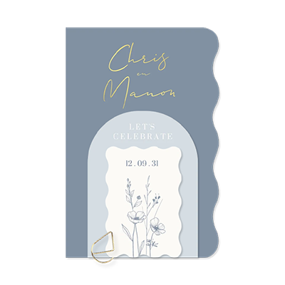 Deze moderne trouwkaart bestaat uit drie lagen met organische vormen in blauwe tinten en een lijntekening van een blauwe bloemen. De donkerblauwe kaart is 11,4x17,1 cm, de lichtblauwe kaart 8x11 cm en het offwhite label 5,5x8 cm. Voeg de kaarten samen met een paperclip voor een strak geheel. Maak jouw bruiloft compleet met andere kaarten uit de trouwhuisstijl Botanical Blue.