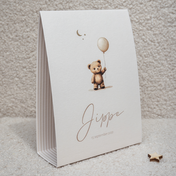 Dit schattige tent geboortekaartje met beertje en ballon is perfect om de geboorte van jullie kindje aan te kondigen. Het uni-ontwerp is rustig en tijdloos, waardoor het kaartje mooi past bij elke stijl. Dankzij de bijzondere tentvorm valt dit kaartje extra op en is leuk om neer te zetten op een kastje of vensterbank!