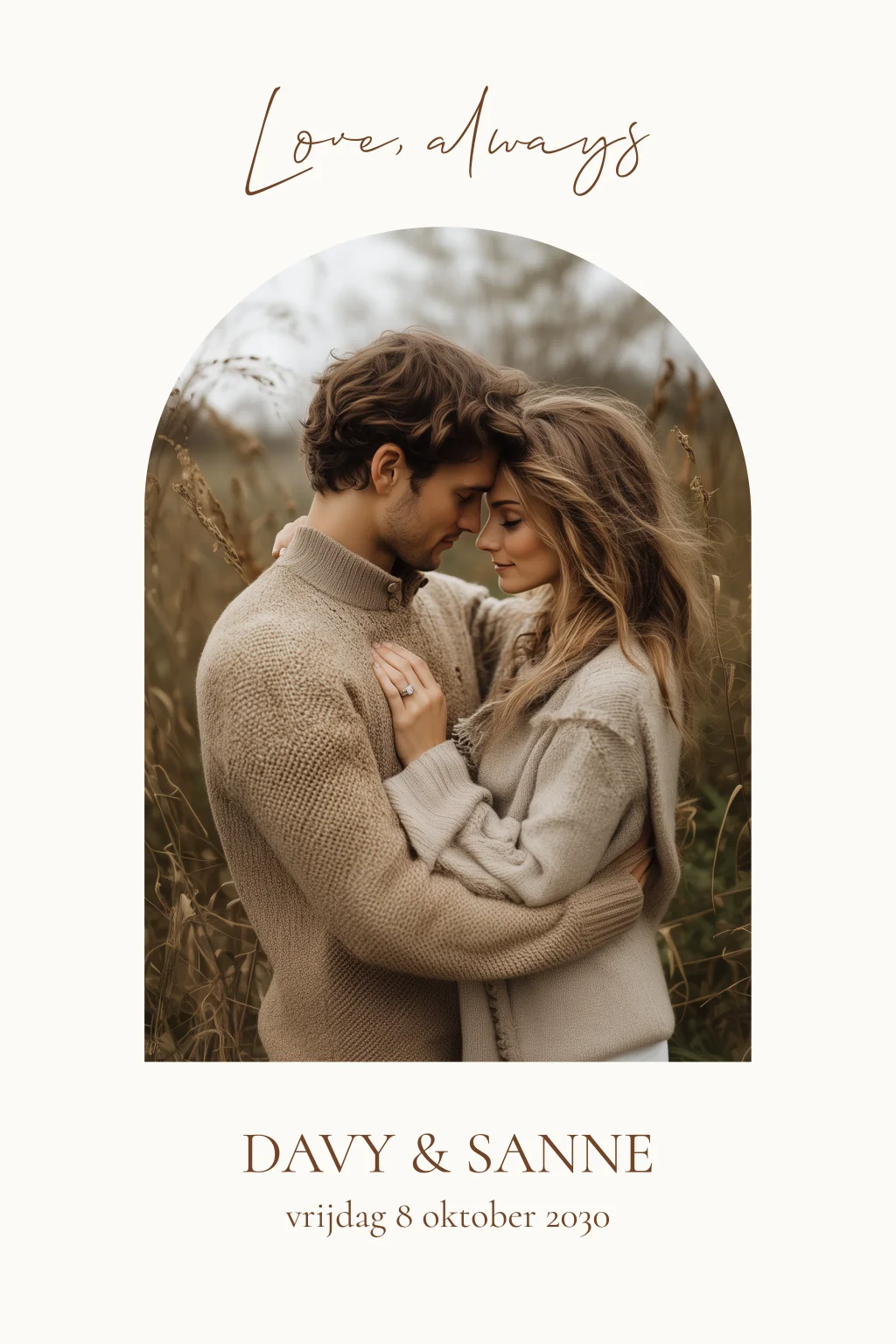 Een poster met de foto van jullie loveshoot of trouwerij is leuk om in jullie huis op te hangen. Zo heb je een tastbare herinnering aan dit bijzondere moment. De poster is 40x60 cm. Liever een ander formaat? Stuur ons een berichtje via het contactformulier en wij helpen jou graag.