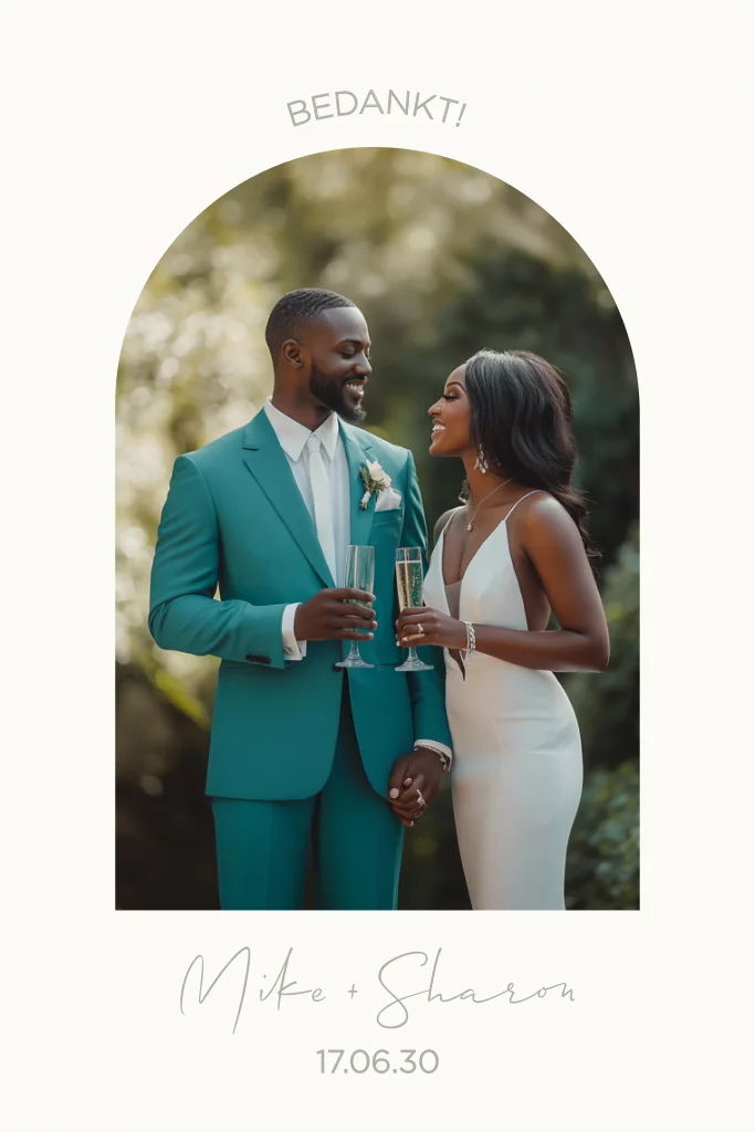 Laat de hippe boogvorm op jullie bedankkaartje terugkomen met een prachtige foto van jullie. Stuur dit kaartje na aan jullie bruiloftsgasten om hen te bedanken voor deze fantastische dag.