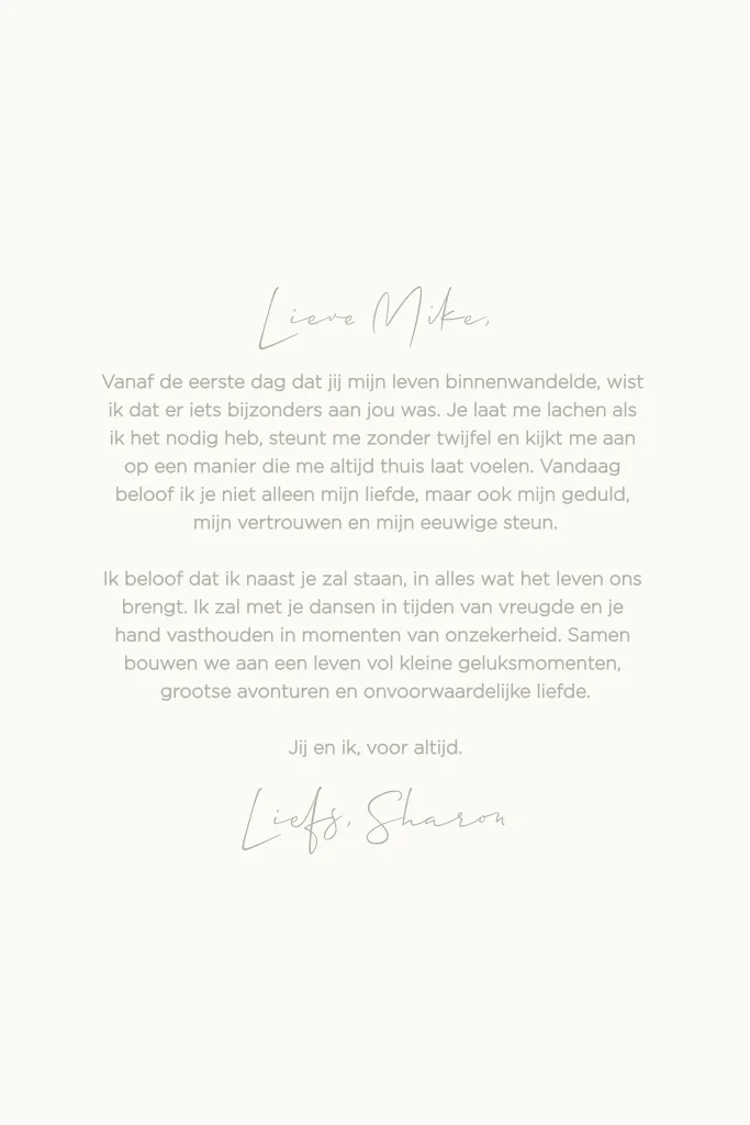 Met dit stijlvolle gelofteboekje leg je jullie persoonlijke woorden vast op een blijvende en mooie manier. Het boekje is perfect om tijdens de ceremonie uit voor te lezen en vormt daarna een waardevolle herinnering aan jullie trouwdag. Personaliseer het boekje met jullie namen, trouwdatum of een korte quote die bij jullie past. Het boekje is opgemaakt in de trouwhuisstijl Botanical Green.