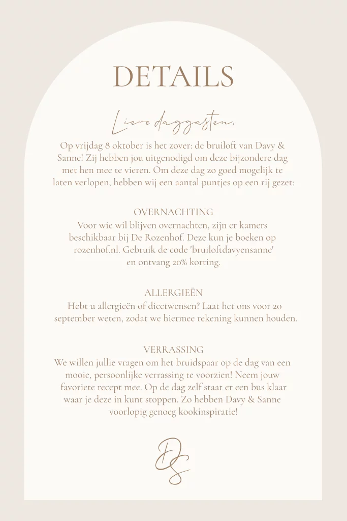 Zorg voor rust op de trouwkaart en zet jullie extra informatie op een los kaartje. Dit extra informatiekaartje sluit aan op de trouwhuisstijl Boho Chic? Zo is jullie gehele trouwhuisstijl een mooi geheel.